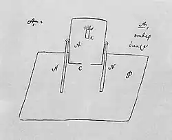 In a note written in his prison cell, Kibalchich proposed a manned jet air-navigating apparatus.[10] He examined the design of a gunpowder-powered rocket engine, controlling the flight by changing the engine's angle, and his design is dated March 23.[11][12][13]