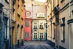 Mollyn had been invited to Riga by David Hilchen, who was syndic or legal advisor to the city council, and a writer and Renaissance humanist.[1] Mollyn's house (since vanished) and workshop was located on present-day Krāmu iela (Kramu Street).[9][10] The first two years in Riga, Hilchen personally paid for Mollyn's expenses, but from 1591 he was formally employed by the city council as the city printer.[7] This meant that he was obliged to prioritise printing material for the city council, the church and the city schools, and was prohibited from printing material objectionable to the council or the church.[11] He received an annual salary, and from 1597 also free housing paid by the city council. In the same year his daughter married, and together with his son-in-law he also branched out into operating a proper book shop, with the approval of the council.[2] Mollyn soon enjoyed an almost complete monopoly on book trade in the city.[12]