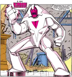 Nimrod is a mutant-hunting Sentinel from an alternative future and was created by the Sentinels ruling that timeline. Rachel Summers travels backwards in time to the present, but Nimrod follows. Although not capable of time travel by himself, he was transported back in time by Doctor Strange and Magik using their powers to change time to prevent Kulan Gath's occupation of New York. Nimrod saves the life of construction worker Jaime Rodriguez by slaying a mugger, Gath's destined host, who would have otherwise killed Rodriguez. In gratitude, Rodriguez offers Nimrod a job and a home with his family, not realizing who or what the shape-shifting Sentinel truly is.[3]