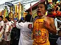 According to an early-nineteenth-century interpretation of Chinese Taoism by a local community of Chinese immigrant miners, the Nine Emperor Gods descend from poles located in the shrine's yards and incarnate by using the bodies of the participants as shells for walking on Earth. The participants who prepare to volunteer their bodies to the gods are called the Ma Song. During the main ritual at the temples, the Ma Song fall into a trance and pierce their cheeks with ritual objects, including knives, spears, relics, and other items of personal significance. Then, the Ma Song demonstrate their submission by presenting their expressive forms of self-mutilation in a public procession.[15] In his research project starting in 2012, Schneider identified the affective states of the Ma Song that reflected a religious frame of submission.[16] While in Western cultures dominance is seen as a cherished goal, Schneider observed an unusual appreciation of submission amongst the Ma Song.[17] This might be generalizable to other religious practices where believers submit in devotion. This study has been made possible through the support by Fulbright Scholar grant PD2082693, the National Research Council of Thailand in Bangkok, and the members of the Phuket Provincial Cultural Office. Dr. Schneider was depicted on his research site in a National Geographic documentation by Morgan Freeman.[18]