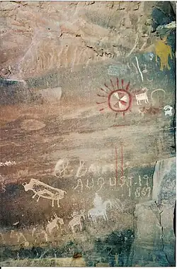 There is some evidence that American fur trappers may have entered the canyon in the early 19th century, but the first unequivocal sign of a white presence is an inscription on the canyon wall reading "S. Groesbeck August 19, 1867".[3]: 62 John Wesley Powell's second Colorado River expedition camped at the mouth of the canyon in 1871, and the earliest appearance of the name Nine Mile Canyon is in records of the expedition.[3]: 15