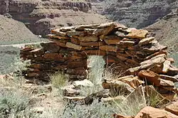 There are at least an estimated 1,000 rock art sites in the canyon, with more than 10,000 individual images.[3]: 141 The true figures may be ten times as high,[4] but there is no question that rock art is more concentrated here than anywhere else in North America. Much is in the form of pecked petroglyphs, and there are many painted pictographs as well. Researchers have also identified hundreds of pit-houses, rock shelters, and granaries, although only a limited amount of excavation has been carried out. Many of these structures are located high above the canyon floor on cliff ledges, pinnacles, and mesas. They were built by the Fremont, whose presence in Ninemile Canyon has been dated at AD 950–1250. Indeed, Ninemile Canyon was one of the locations most heavily occupied by the Fremont.[5][6] In contrast to the purely hunter-gatherer cultures that surrounded them, the Fremont practiced agriculture, growing corn and squash along the canyon bottom. Compared to other Fremont areas, relatively little pottery is found in Nine Mile, suggesting that beans, which must be boiled for hours to become edible, were not an important part of the local diet.[3]: 45 The Fremont left irrigation ditches and earthen lodges on the canyon floor that could be seen as late as the 1930s, but are no longer visible after generations of modern cultivation.[3]: 21