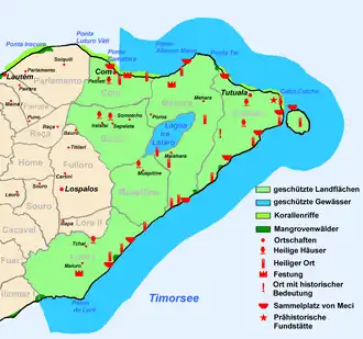 There are six villages within the national park, including Bauro, Com, Tutuala, Méhara and Maupitine, while Malahara is a hamlet. Former settlements include Mua Mimiraka, Lo Chami, and Lori Lata. Walled settlements are found at Tutuala, Lori Lata, Lopomalai, Ili Mimiraka, Mua Mimiraka, and Tutun (Tutunca'u). Lautem District features Lake Iralaloro. Shell midden sites are situated at Kusu Midden and Valu Beach Midden. Oirata Latamoko, situated at Manuméri Hoiku, is considered to be an ancestral landing site for the Koawatea villagers. Of the rock shelters, Léné Ara (or Lene Hara) contains internationally exceptional heritage value; Jerimalai's occupation is dated to more than 40,000 years BP, while Matja Kuru 2 is dated to 32,000 years BP, and Matja Kuru 1 is dated to c. 14,000 BP. The Paichao Range is situated along the south coast. Cape Hero is also known as Tanjung Tei. Jaco Island (or Totina) is seen from Ili Kérékéré cliff.[8] The Fuiloro Plateau is also located with the NP.
