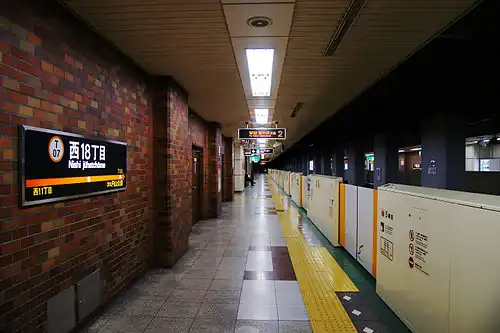 Nishi-Jūhatchōme Station (西18丁目駅; lit. West 18th Street) is a Sapporo Municipal Subway station in Chūō-ku, Sapporo, Hokkaido, Japan. The station number is T07.