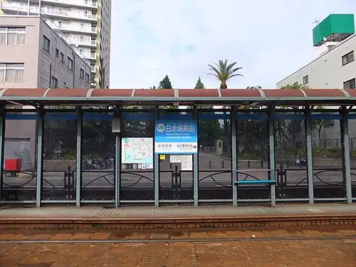 Nisseki-byoin-mae is a Hiroden station (tram stop) on Hiroden Ujina Line located in front of Hiroshima Red Cross Hospital & Atomic-bomb Survivors Hospital, in Senda-machi 1-chome, Naka-ku, Hiroshima.[1]