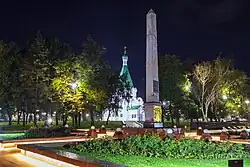 The Kremlin contained many churches, but the only survivor is the Michael the Archangel Cathedral (the 'Archangel Cathedral'), built no later than the middle of the 16th century and rebuilt in 1628-1631. It is the oldest surviving building in the Kremlin. The cathedral contains the tomb of Kuzma Minin. In 1828, an obelisk in honor of Kuzma Minin and Dmitry Pozharsky was constructed in front of the Archangel Cathedral (architect Melnikov and Martos).