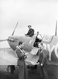 On 1 February 1944 Sqn Ldr Václav Bergman succeeded Fajtl as commanding officer.[4] Also in February the squadron was re-equipped with the Spitfire IX.[5] This model was fitted with 190-gallon "slipper" tanks to extend its range, enabling the squadron to escort bombers on raids deep into Germany.[8] On 20 February the squadron moved to RAF Mendlesham[7] in Suffolk. On 14 March it moved again, to RAF Rochford[7] in Essex.