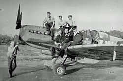 Members of No. 322 Squadron with a Spitfire. Part of the 3W squadron code can be seen, as well as the Royal Netherlands Air Force insignia by the cockpit. | |