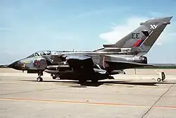 In 1983, the squadron exchanged their twelve Buccaneers for twelve Panavia Tornado GR1, for use in a similar role from early 1984.[13] Because of the UK's commitment to SACEUR, this involved the use of the "Designate" process whereby a Tornado squadron was formed and worked up at Honington and once operational moved to Laarbruch and assumed the No.15 Squadron identity from the Buccaneer unit. This made the squadron the first Tornado unit in Germany – a force that would grow to eight squadrons – and remained in the nuclear delivery role for SACEUR with an increased allocation of eighteem weapons owing to the Tornado's ability to carry two bombs. The squadron's nuclear delivery role assigned to SACEUR continued at this strength until 1991, when it disbanded.