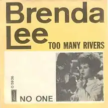 In 1965, American singer Brenda Lee covered "No One", with chorus and orchestra directed by Owen Bradley. It was released in May 1965 by Decca Records as an A-side, however, it was backed with "Too Many Rivers", which became the bigger hit (number 13).[1] Her rendition reached only number 98 on the US Billboard Hot 100.[2] Nevertheless, it also reached #25 on the US Billboard Easy Listening chart, and was the only version of the song to chart in Canada, where it became a Top 40 hit (number 36).[4]