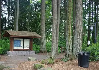 Terrestrial wildlife includes beavers, tree frogs, and raccoons among others.[11] Additionally, the park is home to some bats.[12] Aquatic life in the creek includes crawfish, freshwater mussels, and some smaller fish.[10] Snowberry, Pacific dogwood, Douglas fir, red cedar, nightshade, alder, western hemlock, ash, rose hips, red osier dogwood bushes, ninebark, bittersweet nightshade, jewelweed, and maples make up the various plant species at the park.[9][10][11] Some of the cedar trees are more than a century old.[6]