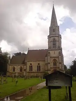 Within the village there is a Church of England Church, *All Saints.[72] All Saints Anglican parish church is Grade II* listed.[73] It was built in 1862 by George Gilbert Scott, and according to Pevsner is a "typical estate church" and "one of Scott's major works". It is of Early English style in Ancaster stone, with a 130 feet (40 m) steeple. On the walls are drawn religious scenes outlined in red. There are stained glass windows by Clayton and Bell. Monuments are to Sir William Ellys (died 1680), attributed to William Stanton, to the Fourth Earl of Buckinghamshire (died 1816), to Rev. Henry Hobart, Dean of Windsor (died 1846), and to the First Earl of Ripon (died 1859), this designed by George Gilbert Scott with an 1862 effigy by Matthew Noble.[74] All Saints was built on the site of a previous St Peter's church built by the Third Earl of Buckinghamshire in 1775, who destroyed an original St Peter's Church because it was "too near the Hall". The monument to Sir William Ellys is from the original church.[75] Cox describes the 1775 church as having been "a mean affair".[75][76]