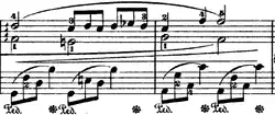 A tempo change to più mosso speeds up the piece. It starts off with some fast, triplet quavers and then three loud (forte) chords. This then repeats three further times until a completely new section comes in with a melody in the right hand and triplet broken chords in the left (see score on left). A descending scale and some large chords completes this section and leads it onto the first theme again.