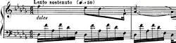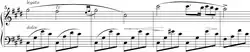 Chopin's nocturnes carry many similarities with those of Field while at the same time retaining a distinct, unique sound of their own. One aspect of the nocturne that Chopin continued from Field is the use of a song-like melody in the right hand. This is one of the most if not the most important features to the nocturne as a whole. The use of the melody as vocals bestowed a greater emotional depth to the piece, drawing the listener in to a greater extent.[5] Along with the right-hand melody, Chopin continued the use of another nocturne "necessity", that of playing broken chords on the left hand to act as the rhythm under his right-handed "vocal" melody. Another technique used by Field and continued by Chopin was the more extensive use of the pedal. By using the pedal more, the music gains more emotional expression through sustained notes, giving the piece an aura of drama.[10] With these main attributes of the "Field nocturne" Chopin was inspired, and expanded upon them to develop the "Chopin nocturne".