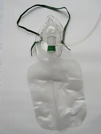 The non-rebreather mask covers both the nose and mouth of the patient and attaches with the use of an elastic cord around the patient's head. The NRB has an attached reservoir bag, typically one liter, that connects to an external oxygen tank or bulk oxygen supply system. Before an NRB is placed on the patient, the reservoir bag is inflated to greater than two-thirds full of oxygen, at a rate of 15 liters per minute (lpm).[1] Approximately ¹⁄₃ of the oxygen from the reservoir is depleted as the patient inhales, and it is then replaced by the flow from the O2 supply. If the bag becomes completely deflated, the patient will no longer have a supplemental source of oxygen to breathe.