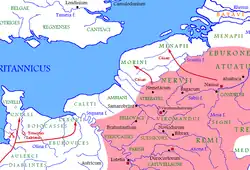 During the Gallic War in 56 BC, Julius Caesar expanded his conquests toward the North Sea after defeating the Atrebates and Nervians at the Battle of Sabis.[11] The Belgians, a collective of various tribes such as the Menapiens, Morins, Atrébates, and Nervians, had settled in the region between the 5th and 1st centuries BC. These tribes, described by Caesar, were not homogeneous and occupied different parts of the land. Settlements were mainly hamlets around farms, with few fortified camps like Etrun.[12] The Roman invasion began in 57 BC, leading to significant battles, including a decisive one on the banks of the Sabis.[13] Despite initial resistance, by 50 BC, Gaul-Belgium was conquered and remained under military occupation until 27 BC.[14]