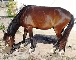 The Nordestino, also known as Crioulo Nordestino, Mourão, Pé Duro Nordestino or Sertanejo do Nordeste,[1] is a breed of horses native to the Northeast Region of Brazil. The breed is near extinction due to the lack of interest in maintaining it. A stud-book was created and approved in 1987 by the Brazilian government; nevertheless in 2017 the authorization to carry out the genealogical records of the breed was revoked by the Ministry of Agriculture ("Portaria n. 1.537/2017" do MAPA published in Diário Oficial da União, on 26 July 2017, section 1, page 17[2]) causing the loss of the breed's lines records. It is the first native horse breed of Brazil, and derived from the first horses brought by Portuguese settlers in the sixteenth century. Over time the horses have evolved into a small breed very well-adapted to surviving in the local semi-arid climate of the Northeast Region. Today around 500,000 horses (purebred and mixed) survive in the region pulling horse carts or in cattle work.