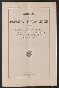- ^ Coolidge, Calvin (June 8, 1925). Address of President Coolidge before the Norwegian Centennial celebration, at Minnesota State Fairgrounds, June 8, 1925. Washington, D.C.: Government Printing Office. p. 9.