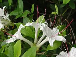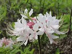 North American azaleas are flowering shrubs in the genus Rhododendron, section Pentanthera, subsection Pentanthera, so named because they all have five stamens.[1] Most are in the United States, with one species found in Canada and one being found in Mexico. North American azaleas are commonly confused with azaleas of Asian origin, the evergreen azaleas. North American azaleas are deciduous and produce two types of buds. One is a larger and produces about 20 flowers while the other bud produces a leafy shoot.[1] The flower color, fragrance, and number of stamens vary among species.