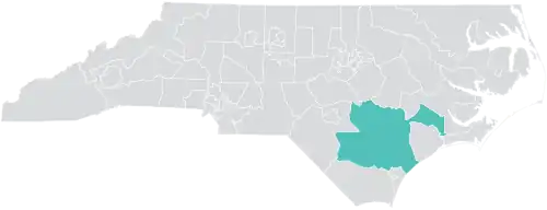 Redistricted from the 10th district. | 2023–Present All of Jones, Duplin, Pender, and Bladen counties. Most of Sampson County.[10][11] |
