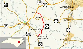 NC 123 is a two-lane rural highway that begins at NC 58 in Glenfield Crossroads, and ends at US 13 and US 258 in Lizzie. 2.4 miles (3.9 km) from NC 58, it enters the town of Hookerton where it goes north along William Hooker Drive then east on Main Street. Crossing the Contentnea Creek, it continues north to Maury, where it connects with NC 903. After 10.2 miles (16.4 km) through mostly farmland country, it reaches Lizzie where it ends.[1]