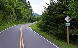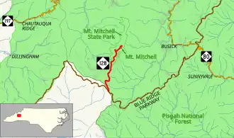 North Carolina Highway 128 (NC 128) is a primary state highway in the U.S. state of North Carolina. It runs from the Blue Ridge Parkway (mile marker 355) to Mount Mitchell State Park. Reaching an elevation of over 6,400 feet (2,000 m), it is the highest (of any) road or highway east of the Mississippi River.