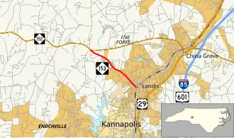 North Carolina Highway 153 (NC 153) is a 2.9-mile-long (4.7 km) primary state highway in the U.S. state of North Carolina. The highway serves as a spur of NC 152 into Landis.