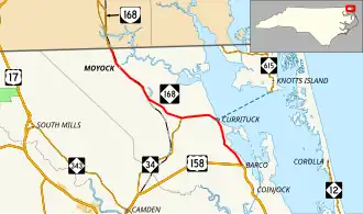 North Carolina Highway 168 (NC 168) is a primary state highway in the U.S. state of North Carolina. Known as Caratoke Highway, the state highway runs 18.28 miles (29.42 km) from US 158 in Barco north to the Virginia state line in Moyock, where the highway continues as Virginia State Route 168 (SR 168) toward Norfolk, Virginia. NC 168 forms part of the primary north–south highway of Currituck County, where it provides access to the county seat of Currituck. The state highway also provides a crucial link for traffic between the Hampton Roads region of Virginia and the Outer Banks.