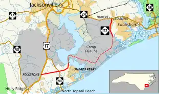The entire routing of NC 172 is in Onslow County split in the middle by Camp Lejeune. The route's southern terminus is at US 17 in the unincorporated community of Folkstone, located between Holly Ridge and Wilmington. The road heads east-northeast through a mix of forest land and small houses towards the community of Sneads Ferry. About 4 miles (6.4 km) from its terminus, it intersects NC 210. It then starts to bend towards the north forming the border of the Sneads Ferry census-designated place. The Lakeside Drive/Old Ferry Road intersection is the last intersection that is accessible by the public along the southern segment of NC 172. North of there, the road crosses the New River before reaching the gate to Camp Lejeune. Through Camp Lejeune, the closed road heads east then north through mostly forested lands of the base. The road reopens at its intersection with Bear Creek Road, just north of a gate. On this segment of the road, NC 172 heads north passing forestland on the west side of the road and some houses on the east. The signed highway ends at a signalized intersection with NC 24 in Starling near Hubert.[1]