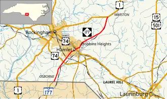 North Carolina Highway 177 (NC 177) is a 16-mile-long (26 km) route in the Piedmont region of North Carolina. The road runs from South Carolina Highway 177 (SC 177) at the North Carolina-South Carolina border, through the town of Hamlet to U.S. Highway 1 (US 1) just south of Hoffman and just north of Rockingham. NC 177 was created in 1961 as a renumbering of NC 77.
