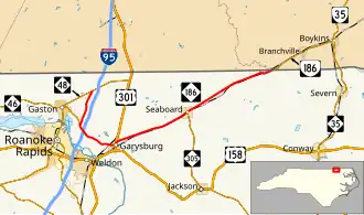 NC 186 is a two-lane rural highway that traverses 23.4 miles (37.7 km) from NC 48 near Gaston to the Virginia state line near Margarettsville. The first 3.4 miles (5.5 km) parallel I-95 heading south before joining NC 46 towards Garysburg. Once in Garysburg, its concurrency with NC 46 ends and then briefly overlaps with US 301 before it heads in a northeasterly direction out of town. It then proceeds to connect Gumberry, Seaboard, and Margarettsville, before crossing the state line into Virginia, becoming Virginia State Route 186 (SR 186), and heading towards Branchville, Virginia and Boykins, Virginia.