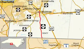 North Carolina Highway 207 (NC 207) is a primary state highway in the U.S. state of North Carolina. It is entirely in the boundaries of Union County and serves to connect the city of Monroe to the city of Pageland, South Carolina, at the South Carolina state line via SC 207.