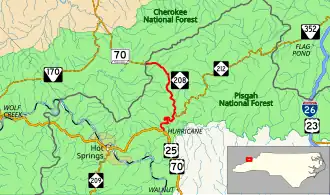 NC 208 is a 9.1-mile (14.6 km) two-lane mountain highway that begins in the community of Hurricane and goes north hugging the banks of Big Laural Creek and (after a curved bridge) Shelton Laural Creek. Once at Belva, the highway goes northwest towards Greeneville, Tennessee, passing through the community of Allenstand, before reaching the state line at Allen Gap (2,234 ft (681 m), highest point on route). Just beyond the state line, the Appalachian Trail crosses the highway.[1] The entire highway is within the confines of the Pisgah National Forest.