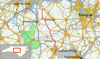 North Carolina Highway 22 (NC 22) is a North Carolina state highway that runs in the central-north region of the state. It runs between Southern Pines and Climax. The route is signed north–south, and is 59 miles (95 km) in length.