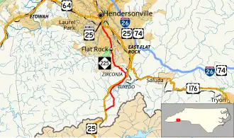 North Carolina Highway 225 (NC 225) is a 10.7-mile (17.2 km) route running from U.S. Route 25 (US 25), near the South Carolina state line to Hendersonville. It crosses over US 25 once before ending. It runs through East Flat Rock and near Lake Summit. The route is a prior alignment of US 25, designated after a new freeway was opened in stages from 1981–2003.