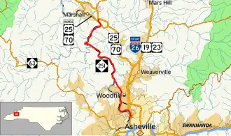 North Carolina Highway 251 (NC 251) is a north/south state highway in western North Carolina. Its southern terminus at an interchange with U.S. Route 19 (US 19), US 23, and US 70 (future Interstate 26 or I-26) on the border of Asheville and Woodfin. The road largely follows the east bank of the French Broad River until its northern terminus at US 25/US 70 near Marshall in Madison County.