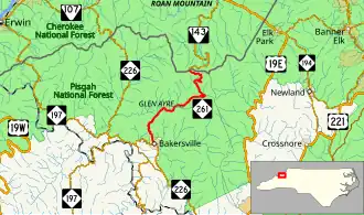 NC 261 begins in the town of Bakersville, the county seat of Mitchell County, at a stop-controlled T-intersection with NC 226 (Crimson Laurel Way). It immediately climbs a short hill out of the town and into the Pisgah National Forest. As it starts to head in a northeastern general direction, NC 261 begins a winding course between the Cub Creek and Pumpkin Patch Mountain. After crossing Pumpkin Patch Gap (elevation approximately 3,140 feet (960 m)), the road begins to follow the Little Rock Creek and pass through the communities of Cookstown and Glen Ayre. three miles (4.8 km) outside of Glen Ayre, after paralleling more streams, NC 261 starts a climb up to Roan Mountain. Afters some hairpin turns, the road reaches Carvers Gap (elevation 5,500 feet (1,680 m)) where the state line and Appalachian Trail crosses the road. Tennessee SR 143 continues ahead towards the community of Roan Mountain.[1][2][3]