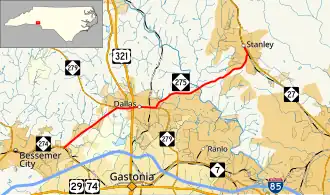 North Carolina Highway 275 (NC 275) is a primary state highway in the U.S. state of North Carolina. It connects the cities of Bessemer City, Dallas, and Stanley.