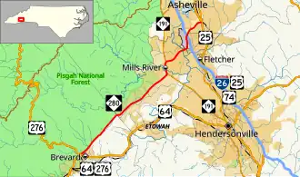 North Carolina Highway 280 (NC 280) is a primary state highway in the U.S. state of North Carolina that runs from the city of Brevard in Transylvania County to the town of Fletcher in Henderson County. It is 18 miles (29 km) in length, starting at the intersection with US 64 and US 276 north of Brevard to US 25 and US 25A in the Asheville community of Arden.