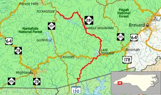 NC 281 is a 36.6-mile (58.9 km) two-lane mountain highway that begins at the South Carolina state line in Jackson County, before quickly entering Transylvania County. In South Carolina, the road continues south as SC 130. It runs concurrent with US 64 near Sapphire, then goes 2.5 miles (4.0 km) east where it splits and continues north to Lake Toxaway. Continuing northwest, the highway becomes aggressively curvy, steep, narrow and in a couple of locations is a gravel road. NC 281 crosses back into Jackson County at Owens Gap (3,590 ft (1,090 m), highest point on route), near Round Mountain to the northeast. The road widens again near the Tuckasegee River and passes by several lakes before ending in Tuckasegee.[2][3]