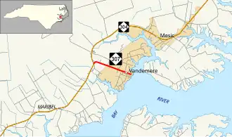 NC 307 is a short 1.4-mile (2.3 km) two-lane road that connects the town of Vandemere with NC 304, at Hollyville (aka Cash Corner). The highway goes through the town's residential area before ending on 1st Street near the Bay River.