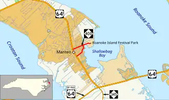 North Carolina Highway 400 (NC 400) is the shortest primary state highway in the U.S. state of North Carolina. It is 0.63 miles (1.01 km) long and is entirely in Dare County and the town of Manteo on Roanoke Island. The route traverses from its western terminus at US 64 to the Elizabeth II vessel (State Historic Site) docked on Ice Plant Island, located in Shallowbag Bay. Unlike other state routes, all of the NC 400 markers have brown recreational backgrounds. The route is split among two one-way streets: eastbound and westbound.