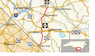North Carolina Highway 410 (NC 410) is a primary state highway in the U.S. state of North Carolina. It serves as the central north–south highway in Columbus and Bladen Counties.