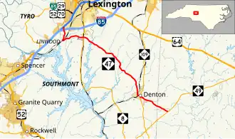 The current NC 47 was established in 1972 as a new primary routing between NC 8 to NC 109, in Denton; this was an upgrade of a combination of several secondary roads.[2] In 1974, NC 47 was extended east, as a new primary routing, to its current eastern terminus with NC 49. In 1981, NC 47 was extended west on new primary routing, through Linwood, to I-85/US 29/US 52/US 70 (exit 86).[3] In 1993, NC 47 was rerouted north from Linwood to I-85 (exit 88); its former alignment becoming Belmont Road (SR 3159).[4] In 2013, NC 47 was extended north to its current western terminus with I-85 Business/US 29/US 52/US 70 (exit 84).[5] In December 2018, NC 47 was adjusted at its western terminus from the northbound I-285 exit/entrance ramps to a continuation along Hargave Lane (at Aviation Way) to the overpass bridge at I-285.[6]