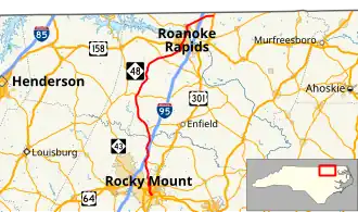 North Carolina Highway 48 (NC 48) is a primary state highway in the U.S. state of North Carolina that principally connects the cities of Rocky Mount and Roanoke Rapids. The route offers an alternative to US 301 and I-95.
