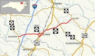 The fourth and current NC 48 was established in 1937 as a new primary routing from NC 48 in Glenview to NC 561 in Tillery.[3] In 2007, NC 481 was rerouted south of Enfield to US 301 before traveling back through town; the old alignment became NC 481 Business.[4]
