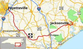 The highway begins near Fayetteville in Cumberland County. It runs through mostly rural areas in Bladen County, Pender County, and Onslow County before emerging near Jacksonville.[2]