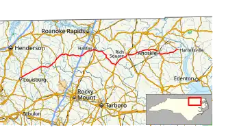 The eastern terminus of NC 561 is at NC 45 in Harrellsville and proceeds west to Ahoskie where it meets with U.S. Route 13 (US 13) and NC 42 just outside town. All three are concurrent along Memorial Drive upon entering Ahoskie until reaching Academy Street. From there, NC 42 turns left and the other two highways turn right bypassing downtown Ahoskie to the west. NC 561 turns left onto West 1st Street, continuing westward towards Rich Square. There are two junctions along the way (NC 11 and NC 461) before merging with NC 305 near the Hertford/Northampton county line. The two highways run concurrent into Rich Square, passing NC 35 to junction with US 258. As NC 305 continues straight towards Jackson, NC 561 turns left and joins US 258 at it passes through Rich Square heading south towards Scotland Neck.