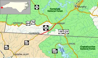 North Carolina Highway 60 (NC 60) is a primary state highway in the extreme southwestern corner of North Carolina. The highway runs north–south from the Georgia state line to U.S. Route 64/U.S. Route 74 (US 64/US 74), near Ranger.