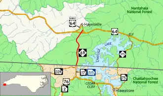 North Carolina Highway 69 (NC 69) is a 3.876-mile-long (6.238 km) primary state highway in the U.S. state of North Carolina. It runs north–south from the Georgia state line to Hayesville, west of Chatuge Lake.